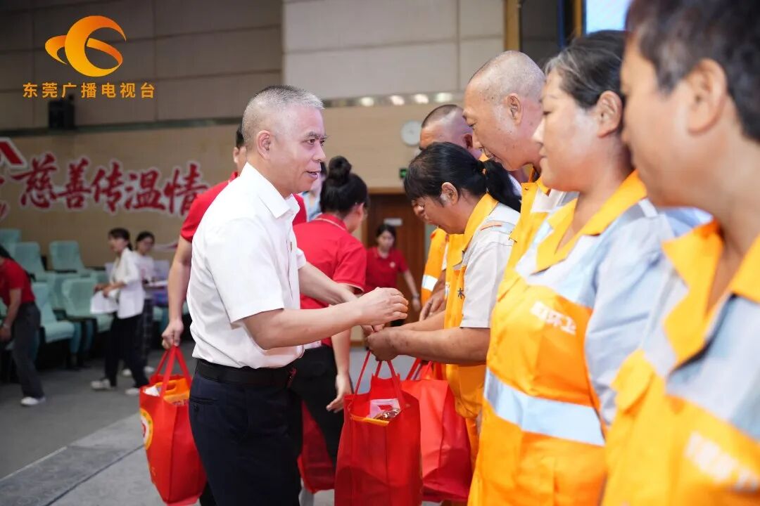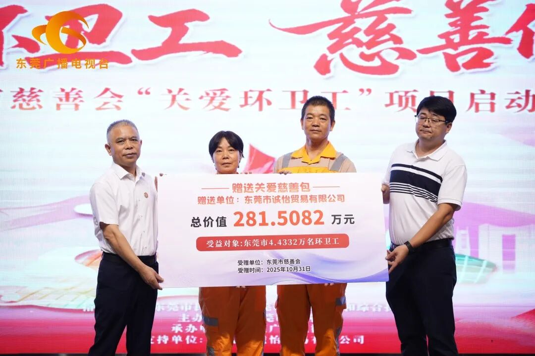 现场,艾树珍代表市慈善会捐赠总价值443.32万元的“关爱包”,王晃洪代表市城市管理和综合执法局向市慈善会授予“情暖环卫 善举同行”荣誉牌匾。此外,东莞市诚怡贸易有限公司向环卫工人代表赠送总价值281.5082万元的“慈善包”,向环卫工人们给予切实、暖心的关怀。