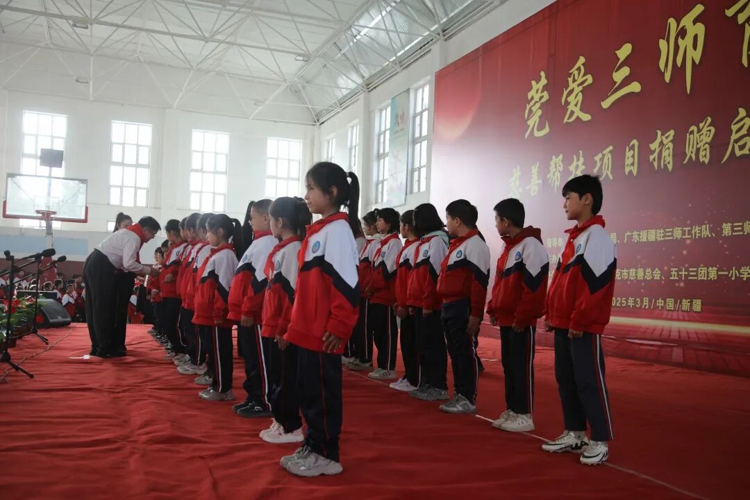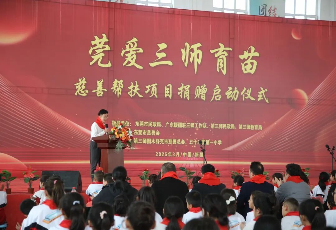 3月21日下午,“莞爱三师育苗”慈善帮扶项目捐赠启动仪式在新疆兵团第三师五十三团第一小学举行。第三师图木舒克市党委副书记、副师长、广东援疆驻三师工作队队长卢建军出席,东莞市民政局党组书记、局长黄荣峰,第三师图木舒克市教育局党组书记、局长周京波,第三师图木舒克市民政局局长郑君,第三师五十三团金胡杨镇党委副书记、团长迈力伟·迪力夏提,东莞市社会组织党委专职副书记、市民政局三级调研员关平,以及第三师五十三团、广东援疆驻三师工作队、爱心企业和慈善会、学校师生代表共100余人参加了仪式。
