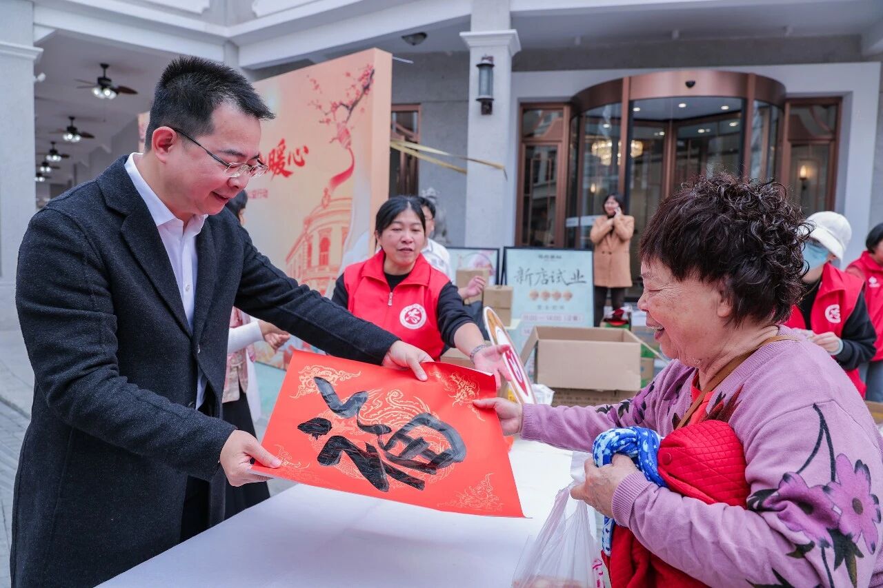 他们不仅送上一碗碗温热的腊八粥,还带来了满载心意的米、油等生活物资。更令人温暖的是,由现场志愿者书法家亲手书写的红“福”字,也被一同送到长者家中。