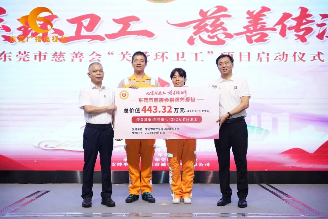现场,艾树珍代表市慈善会捐赠总价值443.32万元的“关爱包”,王晃洪代表市城市管理和综合执法局向市慈善会授予“情暖环卫 善举同行”荣誉牌匾。此外,东莞市诚怡贸易有限公司向环卫工人代表赠送总价值281.5082万元的“慈善包”,向环卫工人们给予切实、暖心的关怀。