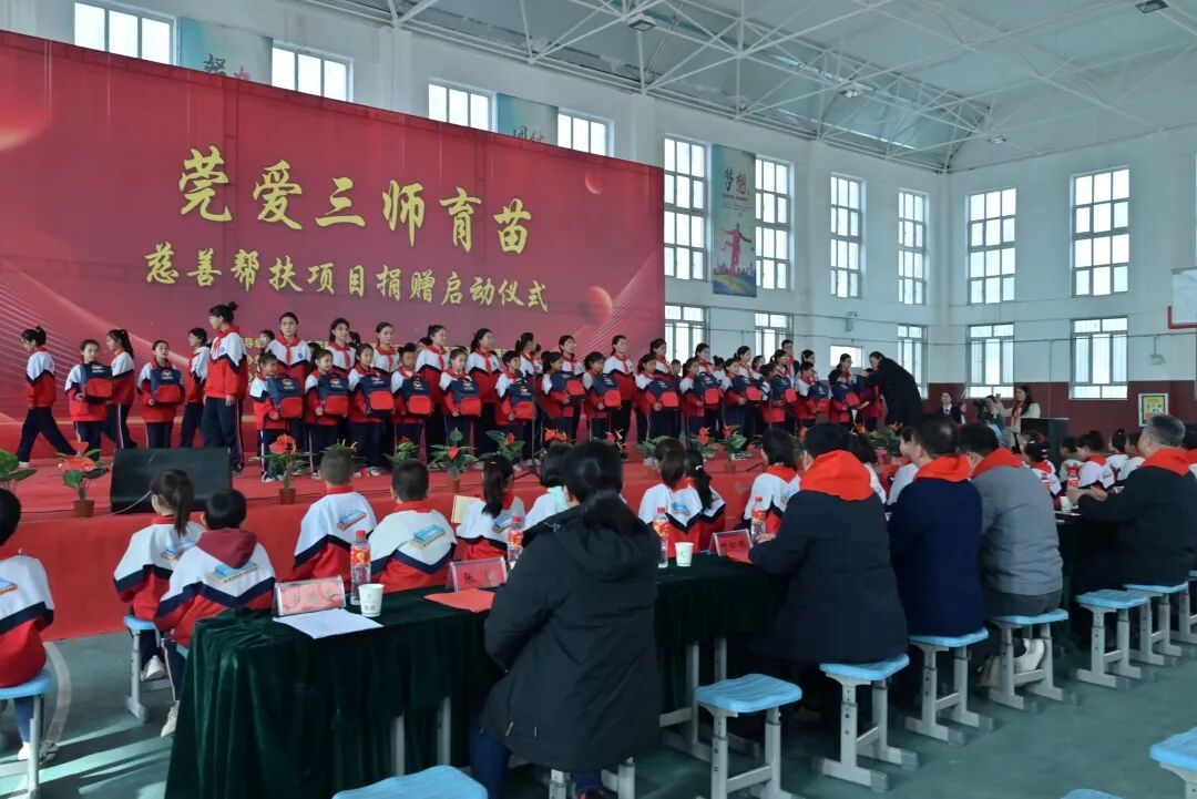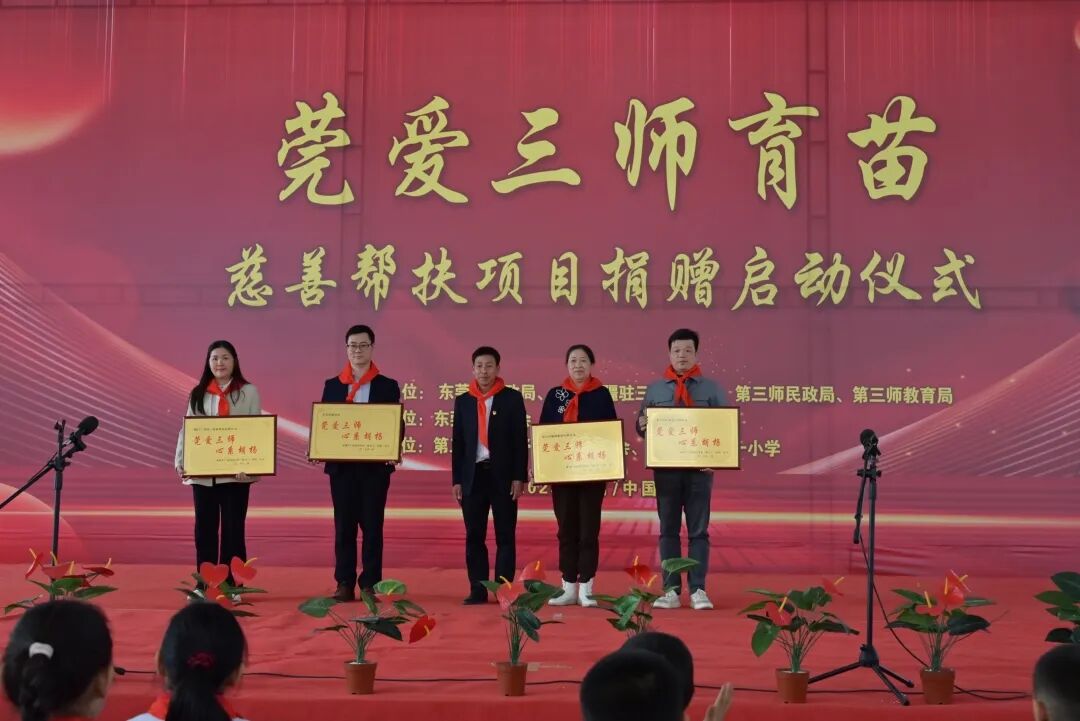 3月21日下午,“莞爱三师育苗”慈善帮扶项目捐赠启动仪式在新疆兵团第三师五十三团第一小学举行。第三师图木舒克市党委副书记、副师长、广东援疆驻三师工作队队长卢建军出席,东莞市民政局党组书记、局长黄荣峰,第三师图木舒克市教育局党组书记、局长周京波,第三师图木舒克市民政局局长郑君,第三师五十三团金胡杨镇党委副书记、团长迈力伟·迪力夏提,东莞市社会组织党委专职副书记、市民政局三级调研员关平,以及第三师五十三团、广东援疆驻三师工作队、爱心企业和慈善会、学校师生代表共100余人参加了仪式。