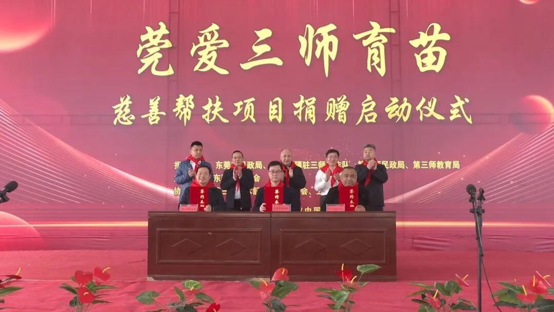 仪式中,在卢建军、黄荣峰、周京波、郑君、迈力伟·迪力夏提等领导的共同见证下,东莞市慈善会、第三师图木舒克市慈善总会、第三师图木舒克市教育局签署“莞爱三师育苗”慈善帮扶项目三方捐赠协议书。