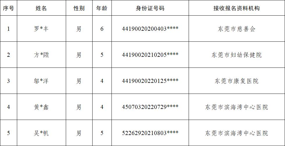 为确保慈善救助工作公开、公平、公正,根据《东莞市慈善会“星光行动”孤独症儿童康复救助项目实施方案(试行)》有关规定和“星光行动”孤独症儿童康复救助项目审核委员会的审核意见,现将通过审核的5名拟资助对象名单向社会公示,请社会各界予以监督。公示期间,如对公示内容存在异议,请迳向东莞市慈善会反映。联系电话:黄小姐0769-22227699、钟先生0769-22222628。